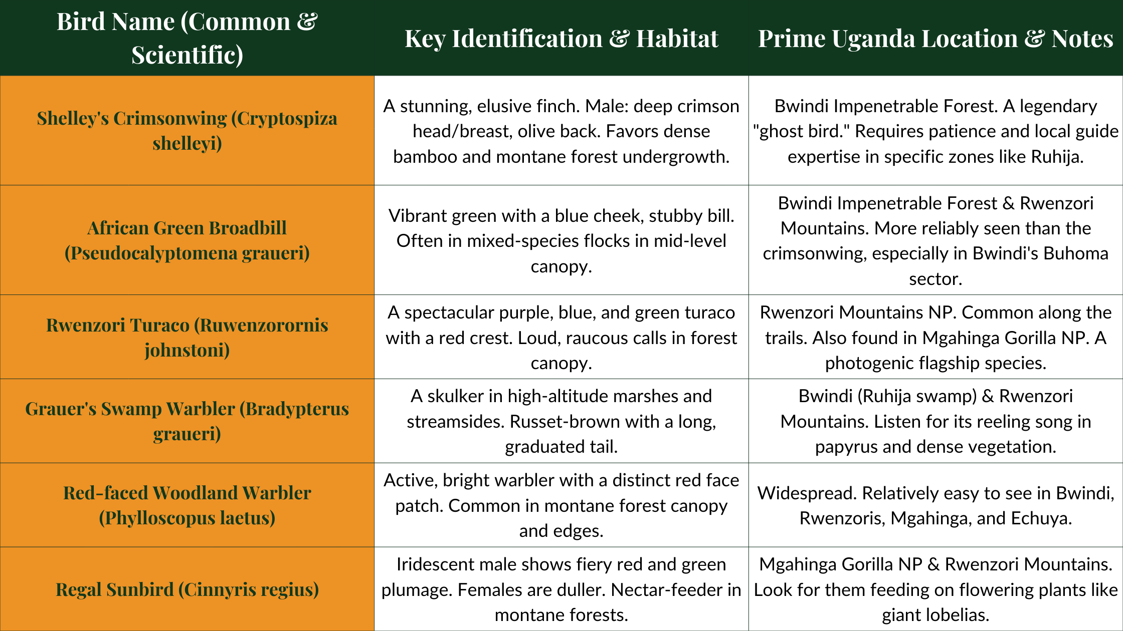 Endemic Highlights: Rwenzori Turaco, Rwenzori Batis, Scarlet-tufted Malachite Sunbird (near-endemic), and Rwenzori Nightjar.