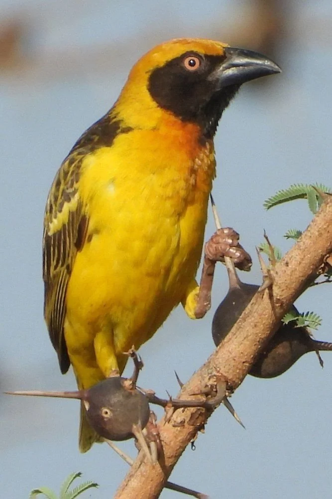 Key Insight: Look for their messy, colonial nests in acacia trees near water. Breeding males (black-headed) are most distinctive.